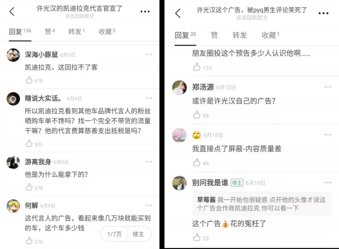“这回凯迪拉克拉不了客”、“他为什么能拿下这个代言”等质疑接踵而至,就连凯迪拉克在朋友圈投放的广告也遭遇到了群嘲,直言这波精准投放失败。