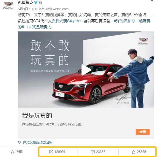易烊千玺成为代言人当天,宝马官宣微博在6小时后转发破百万、点赞破百万,粉丝在10w+评论中纷纷晒单。而截止目前,凯迪拉克的许光汉官宣微博转发刚超12万,评论点赞数至今未超3万。
