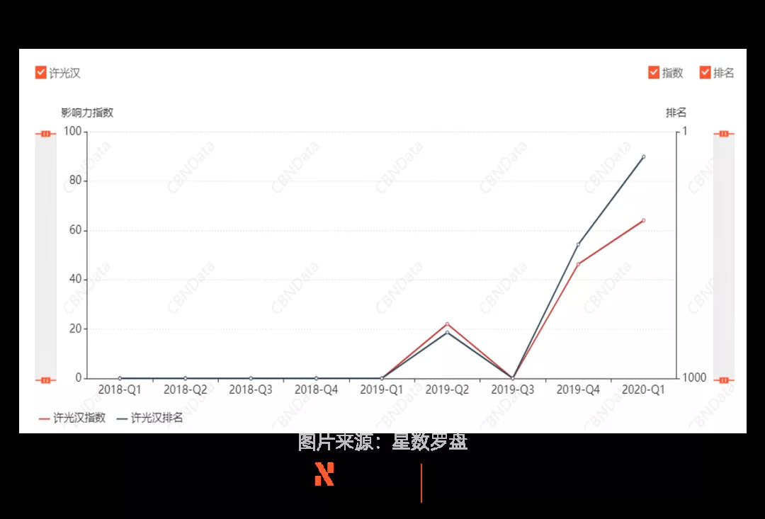 根据CBNData星数发布的明星消费影响力指数,许光汉的消费影响力排名也在一路攀升,2019年还未入榜的他在2020一季度达到了102名,但离上位圈仍有差距。