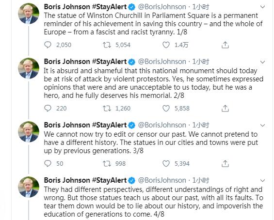 英国首相约翰逊连发8推谈前首相丘吉尔雕像被毁一事,他表示丘吉尔是个英雄,值得被纪念。他还表示抗议活动已经被“极端分子”劫持,对警察的袭击和无差别的暴力活动令人无法容忍,并呼吁民众远离抗议活动。