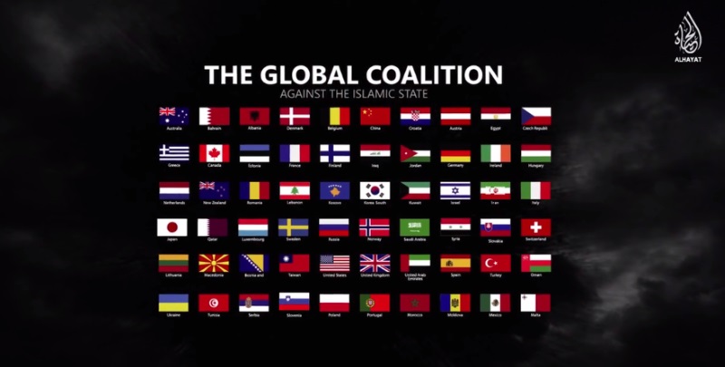 在3分05秒时,影片展示出60面国旗,指这些是“反伊斯兰国全球盟军”,其中包括中华人民共和国和中国台湾地区旗帜。