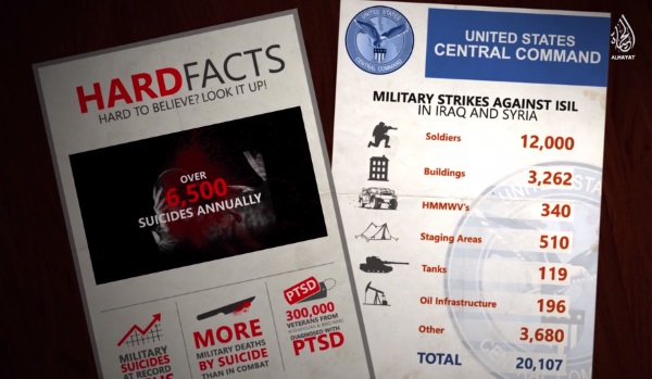 报道称,这段4分多钟的影片在11月24日发布,画面制作质量相当高。“伊斯兰国”组织在影片中花了较多时间批评美国发动针对穆斯林和“伊斯兰国”的战争,指这些战争耗费巨量金钱,造成大规模伤亡,还让参战士兵留下严重的后遗症,平均每天18人自杀。此外,该视频还特写了三任美国总统奥巴马、小布什和克林顿的头像。