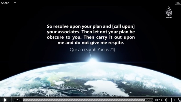片段最后出现了《古兰经》中的一段经文,大意是对自己的计划下定决心并寻找同伴,不要让计划变得模糊,然后要执行计划,刻不容缓。