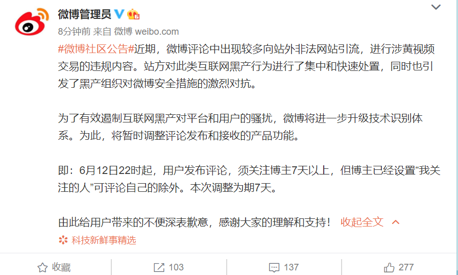 为了有效遏制互联网黑产对平台和用户的骚扰,微博将进一步升级技术识别体系。为此,将暂时调整评论发布和接收的产品功能。