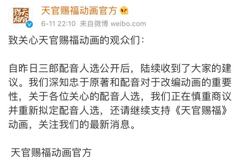 6月11日晚间,《天官赐福》动画官方发布声明称,关于配音人选一事,动画官方正在慎重商议并重新拟定配音人选。