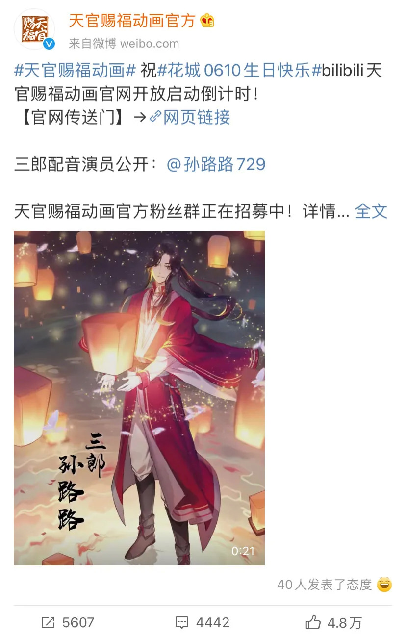 6月10日12:00,由B站、绘梦动画出品,绘梦动画制作的网络动画《天官赐福》,用一段时长30秒的预告PV,正式公开了动画主角花城(三郎)的配音演员——来自729声工场的配音界新人孙路路。