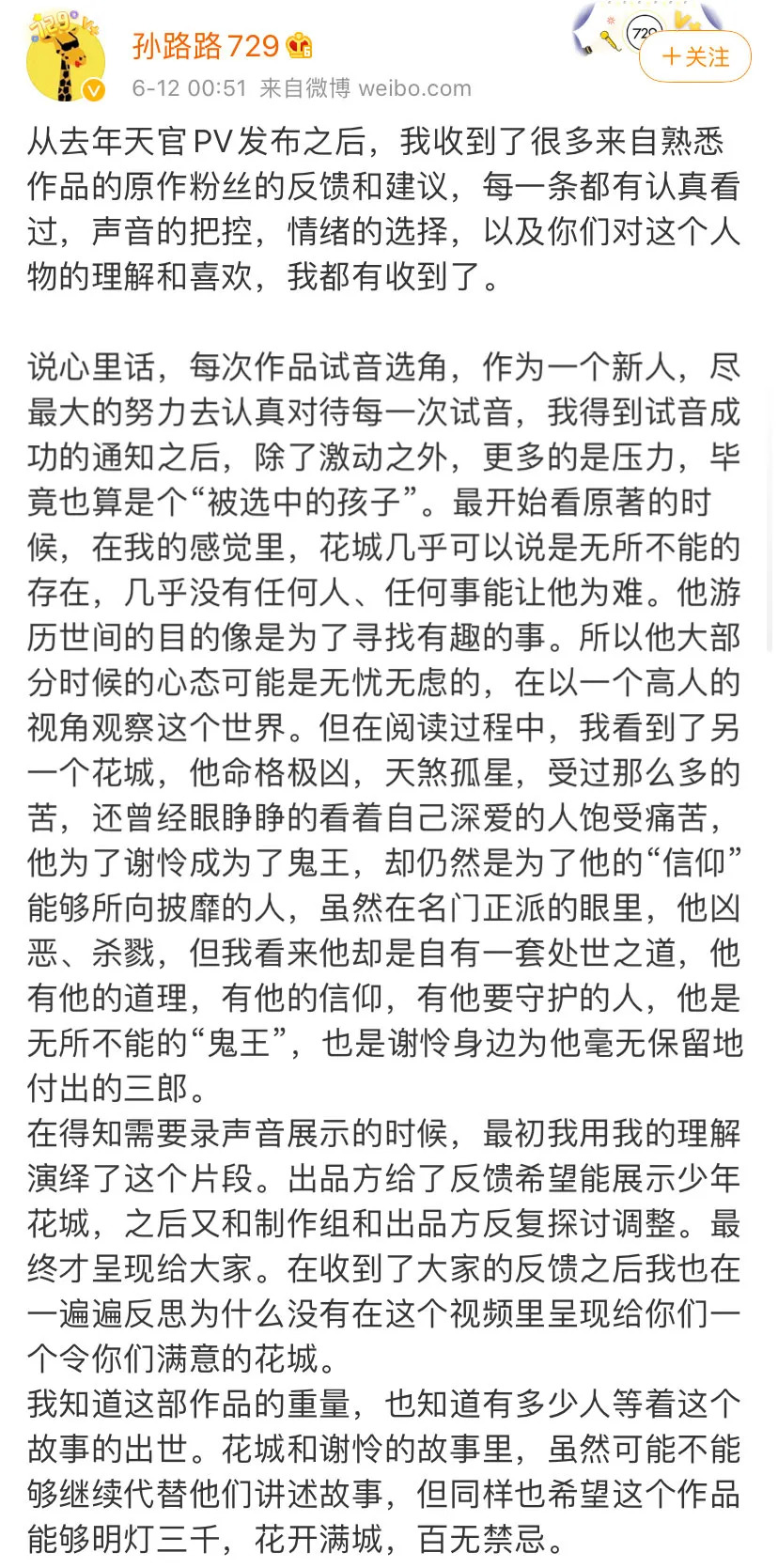 而原来拟定为花城配音的孙路路,也很快在微博发布了相关博文,以非常平和诚恳的语气讲述了自己与动画官方在幕后揣摩角色的历程,希望能够以此来安抚粉丝的不满情绪。