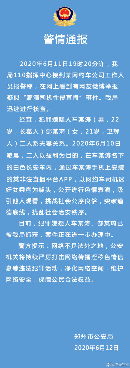 @平安郑州 6月12日消息,2020年6月11日19时20分许,我局110指挥中心接到某网约车公司工作人员报警称,在网上看到有网友微博举报疑似“滴滴司机性侵直播”事件。我局迅速进行核查。