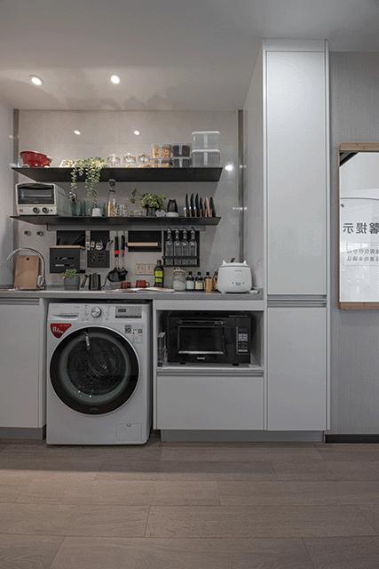 如在厨房,2米的超大操作台游刃有余,精细化分隔的橱柜右侧预留出微波炉、大型锅具的存放空间。中间放置洗烘一体的洗衣机。左侧6层设计的通高拉篮,超大容量可放置零食、饮料等。