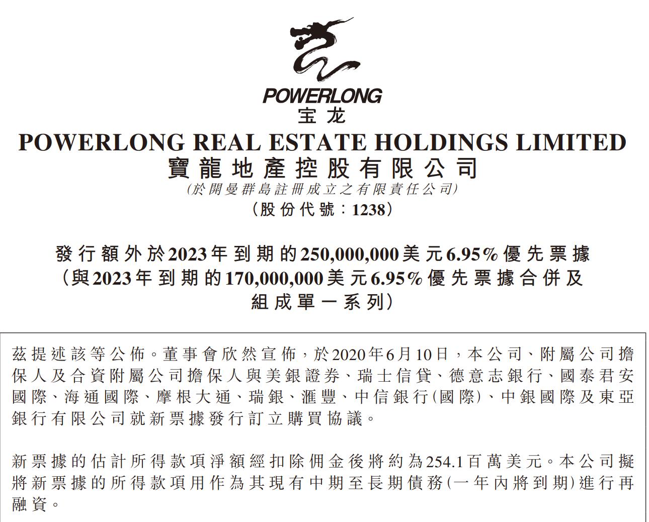 该笔票据与宝龙地产此前发行的1.7亿美元优先票据合并成单一系列。新票据所得款项均将用于宝龙地产现有一年内到期中期至长期债务的再融资。