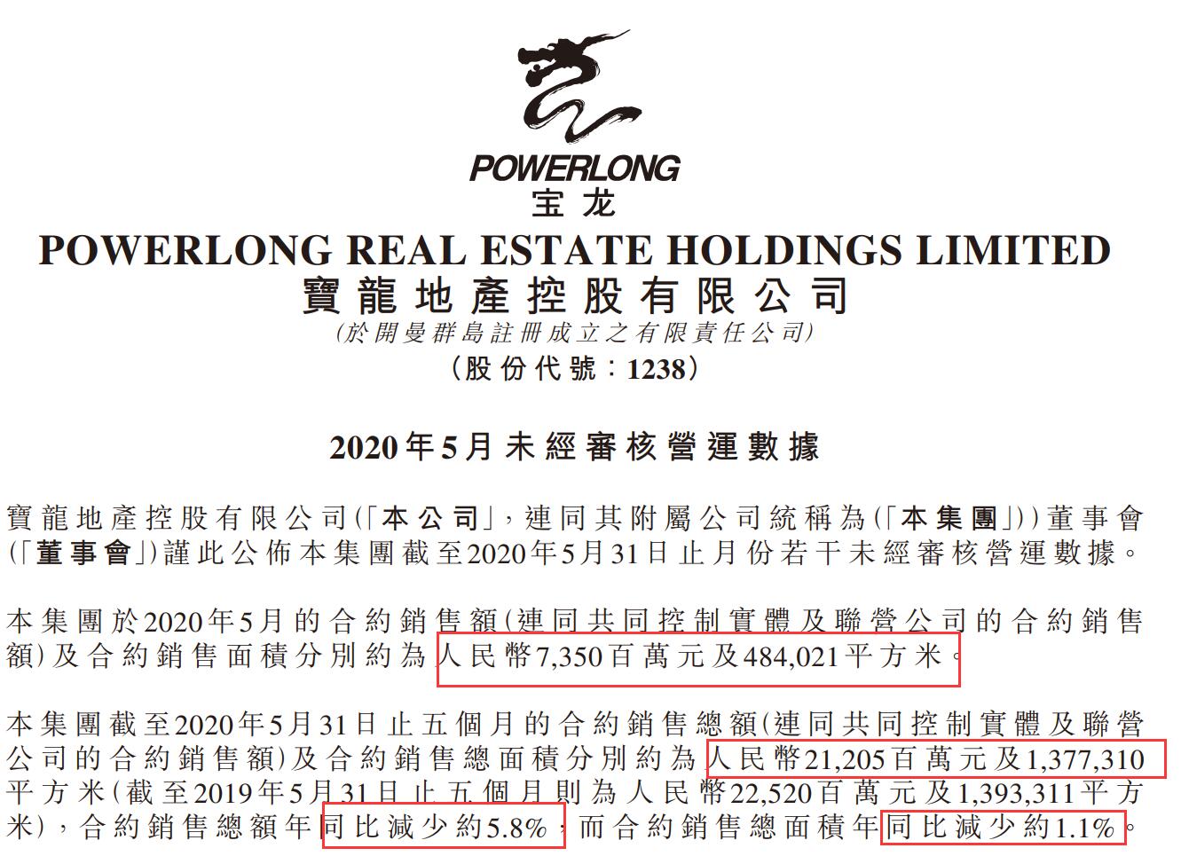宝龙地产方面,据其公告,5月的合约销售额为73.5亿元,销售面积48.4万平米。