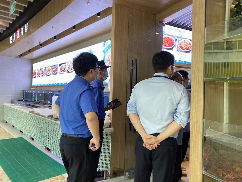 界面新闻在北京丰台区万达广场走访看到,已经有相关部门人员在所有可能出售三文鱼等冷鲜产品的餐饮门店排查。