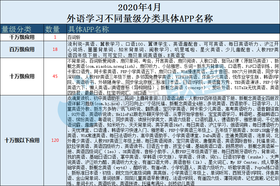 十万级应用数量从56个减少至45个,4月流量红利结束之后,该级别部分应用用户回落至十万级以下,例如:“点滴复读机”“初中英语助手”“拓词-上瘾背单词”“新概念英语全四册双语详解习题版”“多说英语”等APP。