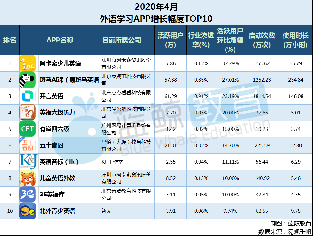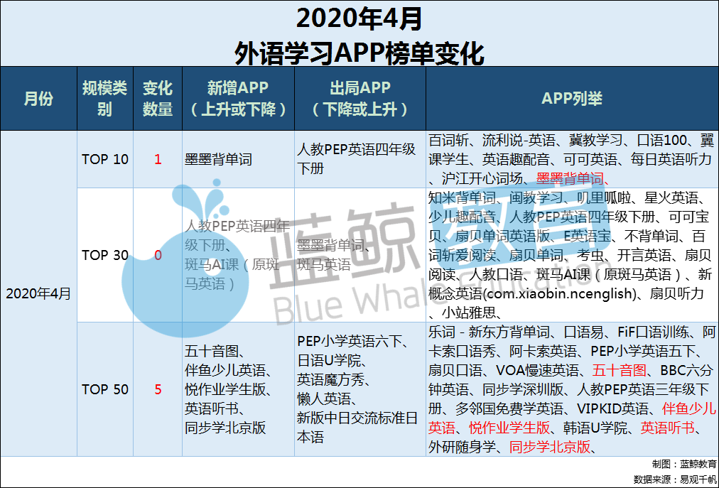 TOP 50 榜4月末新入围APP有“五十音图”“伴鱼少儿英语”“悦作业学生版”“英语听书”“同步学北京版”,出局APP有:“PEP小学英语六下”“日语U学院”“英语魔方秀”“懒人英语”“新版中日交流标准日本语”。