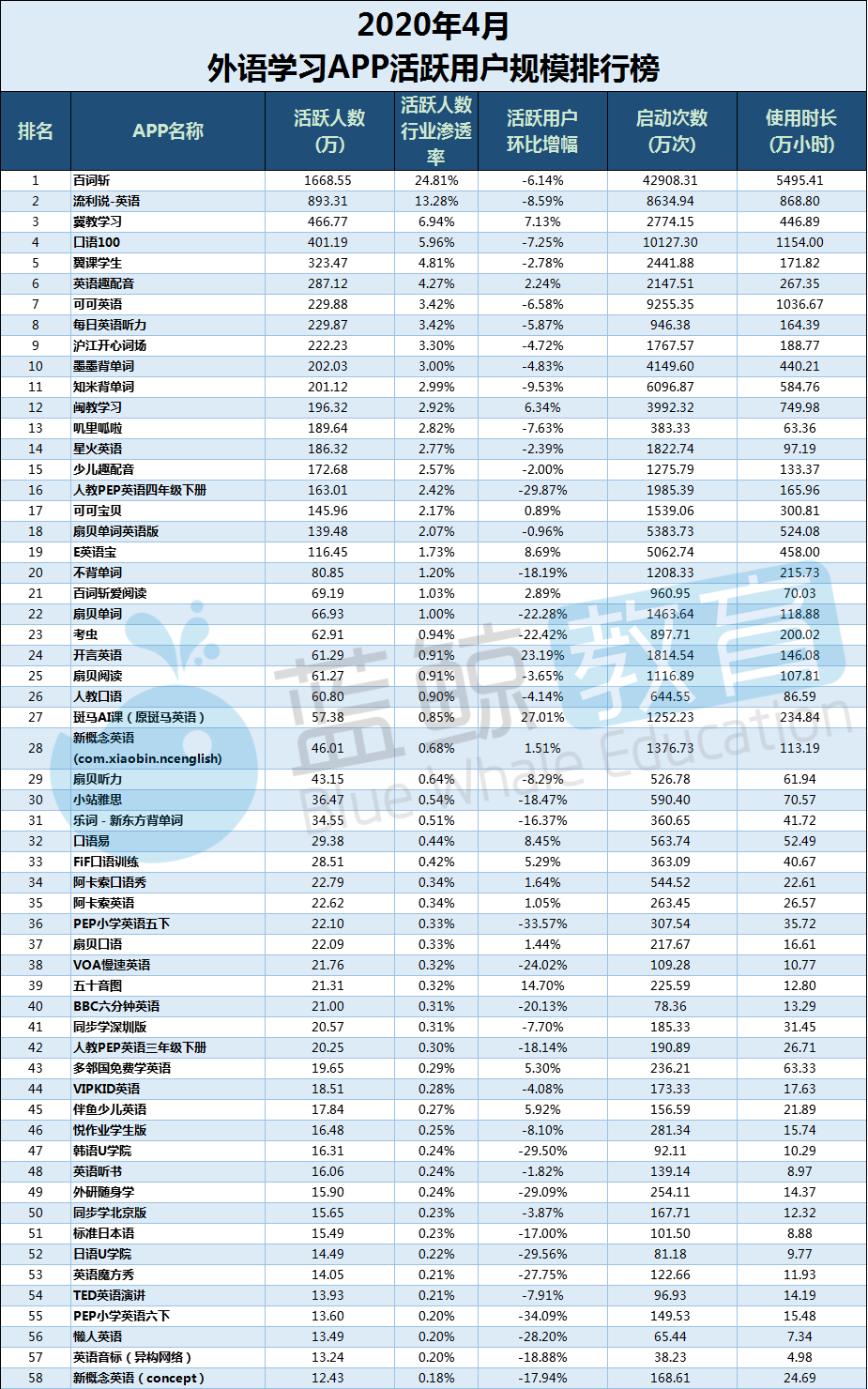 下面是2020年4月末184家外语学习活跃APP的详细排名,排名按照用户规模,包括活跃人数、启动次数及使用时长等维度数据(横线代表没有相关数据),供大家查阅:
