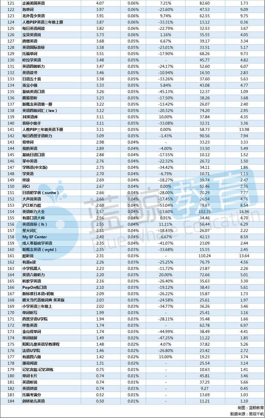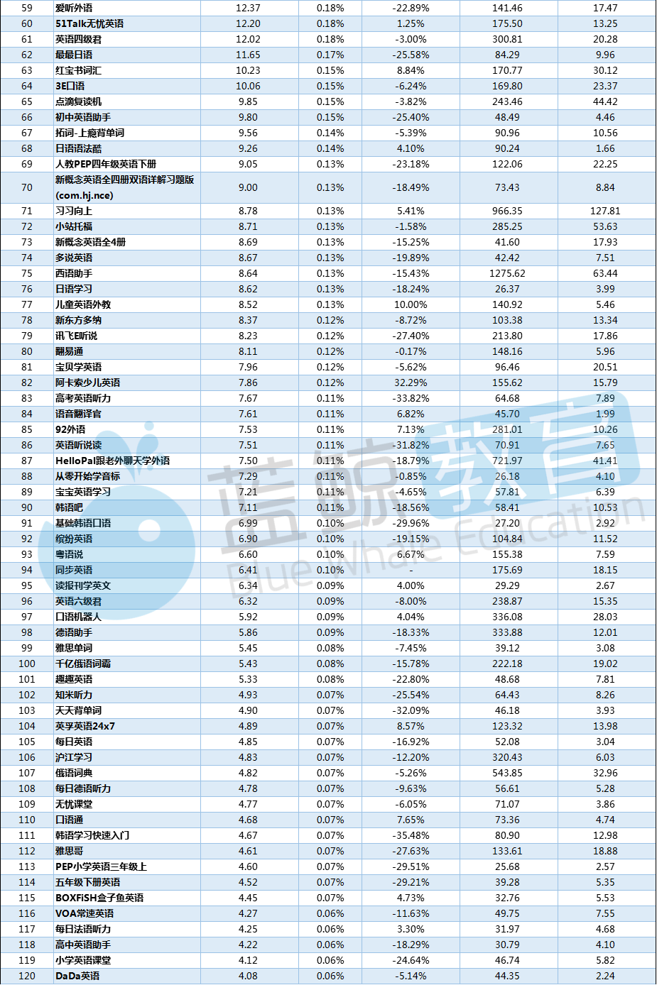 涨跌比较明显的APP还有:“人教PEP英语四年级下册”下跌29.87%,“不背单词”下跌18.19%,“扇贝单词”下跌22.28%,“考虫”下跌22.42%,“PEP小学英语五下”下跌33.57%,“VOA慢速英语”下跌24.02%,“BBC六分钟英语”下跌20.13%,“韩语U学院”下跌29.50%,“外研随身学”下跌29.09%,“日语U学院”下跌29.56%,“PEP小学英语六下”下跌34.09%,“人教PEP四年级英语下册”下跌23.18%,“高考英语听力”下跌33.82%...