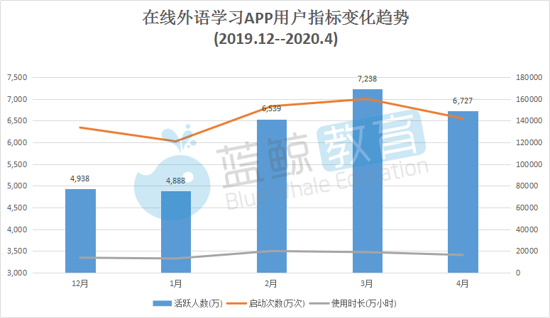 易观千帆网数据中心统计显示,2020年4月末外语学习APP共184个,活跃用户6,727万,占教育全网用户比例15%,与3月末相比,用户减少512万,下跌7%,整体来看,外语学习停下第一季度流量暴涨的脚步,尤其是小众APP回落明显,小于十万级的APP新增了21个,而千万级与百万级应用并没有增加。下图是2019年12月底至2020年4月末,外语学习APP的用户指标变化趋势: