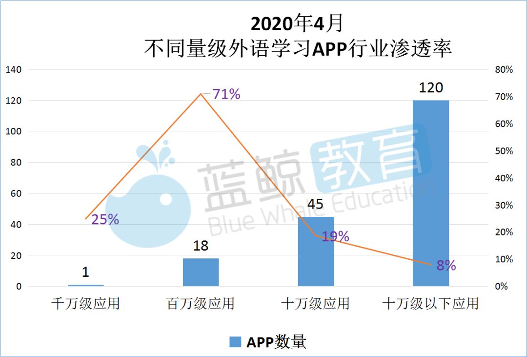 百万级用户规模的APP,用户渗透率加起来达71%,是除“百词斩”外最有潜力的一批应用,例如2月末突破千万级规模的“流利说”等;4月末整体下跌环境下还在上涨的应用:冀教学习4月末再涨7.13%,位列第三名,闽教学习4月末上涨6.34%,排名第12,“E英语宝”上涨8.69%,位列第十九名。