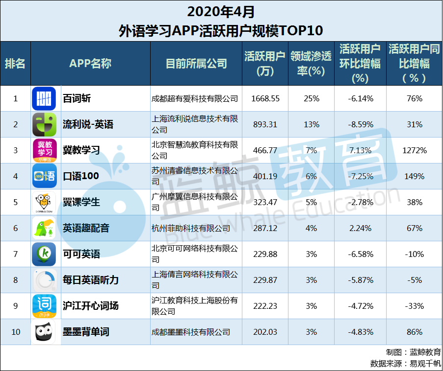 下面是活跃用户规模TOP 10,进入前十的APP有:“百词斩”“流利说-英语”“冀教学习”“口语100”“翼课学生”“英语趣配音”“可可英语”“每日英语听力”“沪江开心词场”“墨墨背单词”。以下是这10大APP 2020年 4月末的用户规模、用户规模的环比增长、同比增长以及领域渗透率: