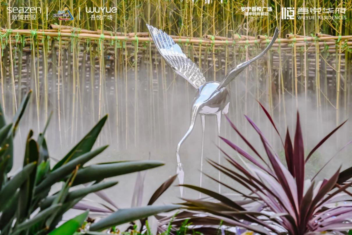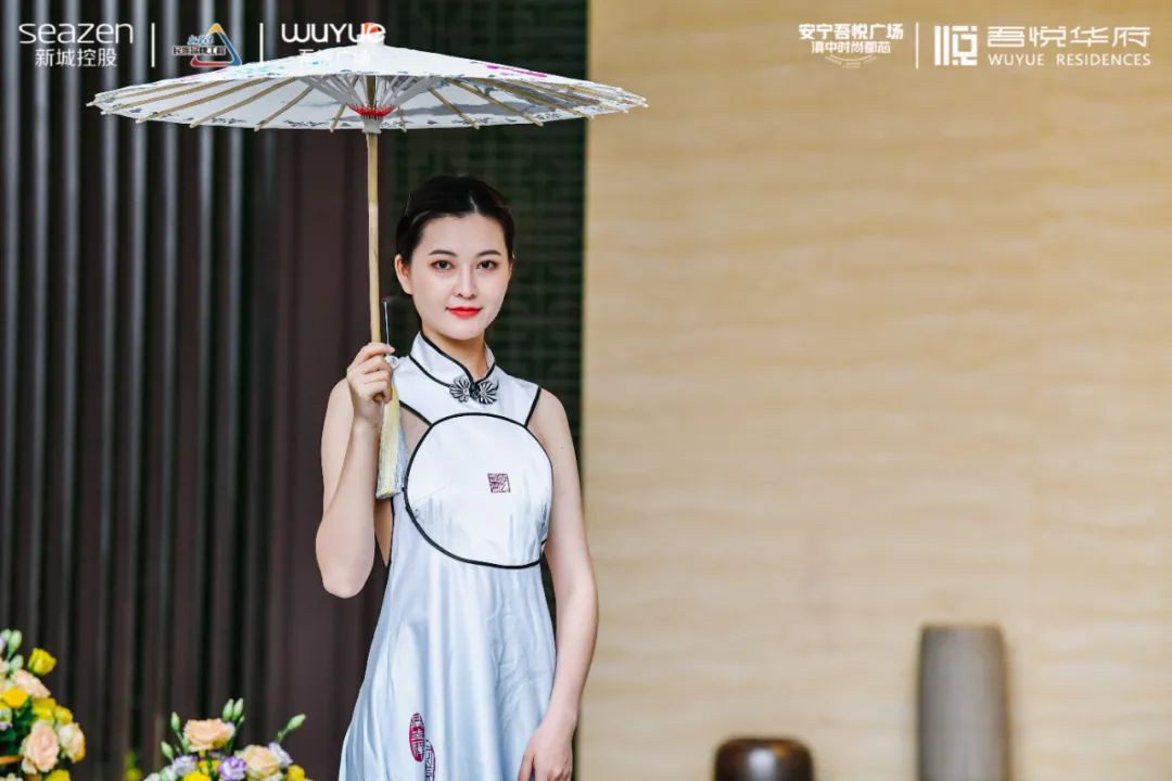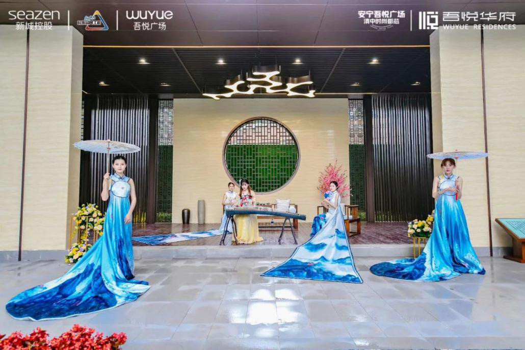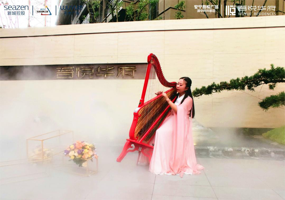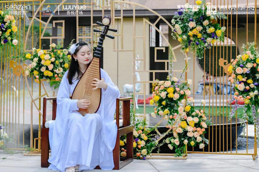短短的一段路,曲折而又新奇,移步换景,一步一景。箜篌、茶艺、琵琶演奏穿插在园区内,让人感觉在吾悦华府的美学样板园区,上了一堂博大精深的中国传统文学课。