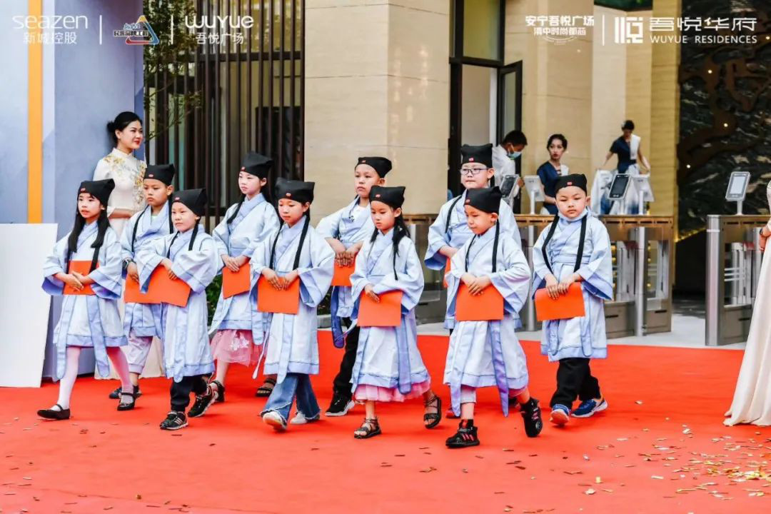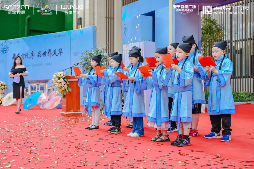 气球升空之后,一群可爱的小朋友,在舞台上为观众们诵读三字经,朗朗童声与样板园区新中式的华美氛围相得益彰,随着表演结束肖总与赵总共同引领着这群可爱的小朋友缓步穿过寓意着吉祥喜庆的大门,带领到访的众多业主与社会各界的朋友进入样板园区进行观赏。