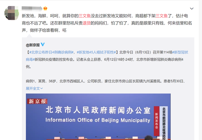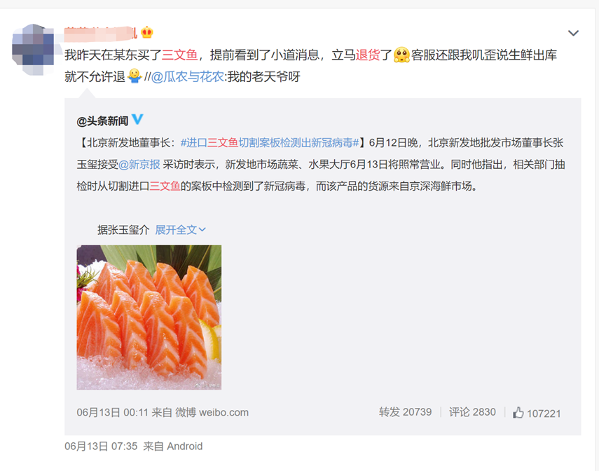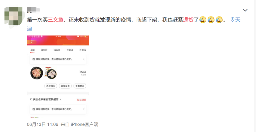 “第一次买三文鱼,还未收到货就发现新的疫情,商超下架,我也赶紧退货了”