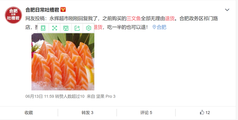 “永辉超市刚刚回复我了,之前购买的三文鱼全部无理由退货。合肥政务区祁门路店,携带购物小票,去总服务台退货,吃一半的也可以退!”