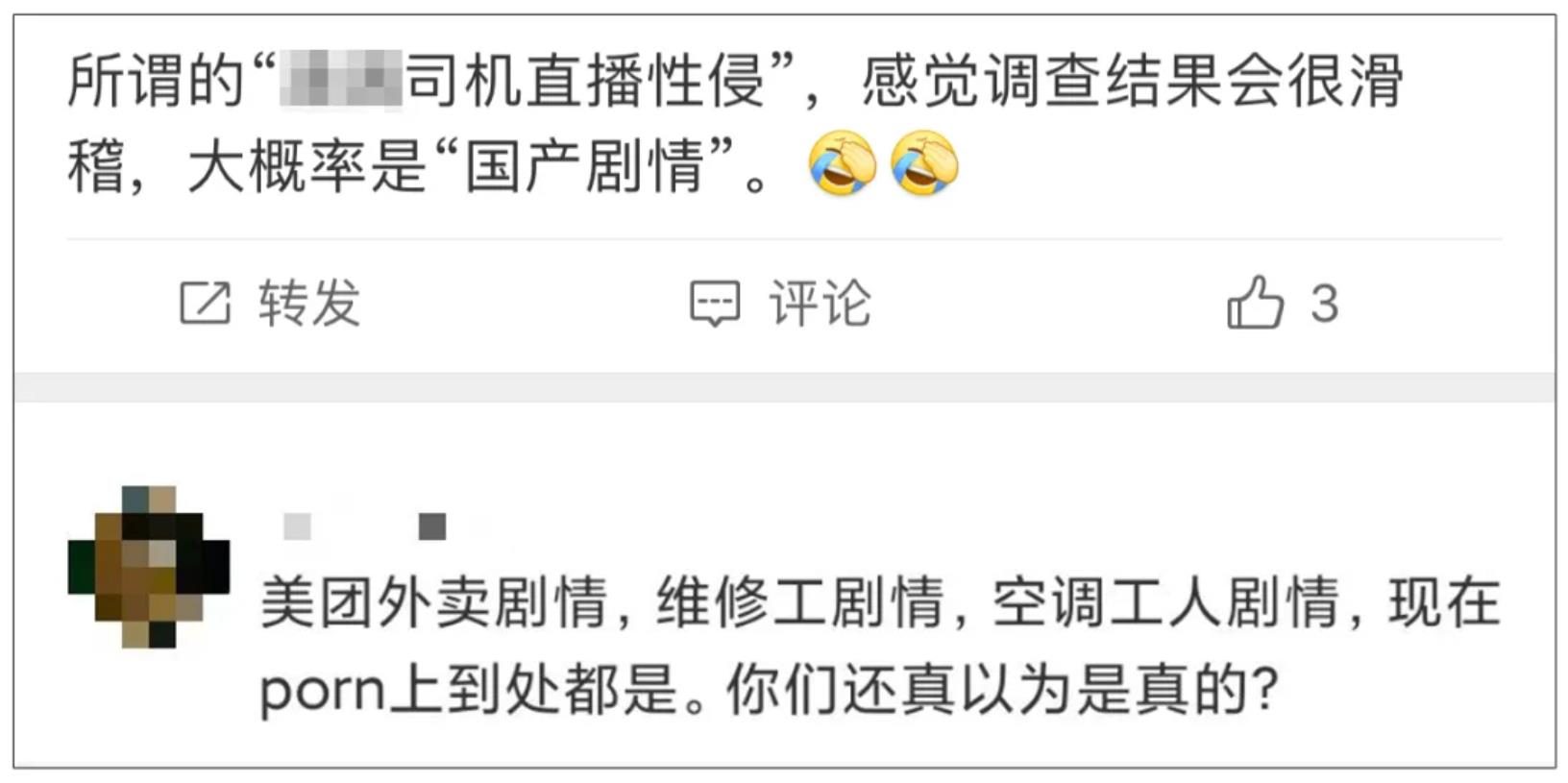 在此次“司机直播性侵”事件中,有不少人在得知直播内容可能是当事人“自导自演”后表示,这类包含性暴力情节的色情影片在日本和欧美很常见,如果中国能将其合法化,就可以避免很多不必要的纷争和恐慌。换句话说,这些人并不认为事件中的性暴力直播本身有什么不妥,唯一的问题只是当事人是否具有犯罪事实。然而,这真的是色情影片与性暴力直播之间的唯一区别吗?