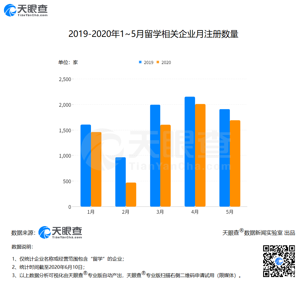 据华夏时报报道,全球疫情下,留学中介机构的生意开始降温,当留学中介机构收入大幅减少时,还有一些机构则直接关门歇业。天眼查专业版数据显示,我国目前有近8万家企业名称或经营范围含“留学”,且状态为在业、存续、迁入、迁出的企业(以下简称“留学相关企业”),有限责任公司占比高达93.32%。 值得注意的是,截至6月10日,以工商登记为准,2020年1月1日至5月31日,我国新增注册的留学相关企业达7,411家(全部企业状态),同比增长-16.09%。具体来看,今年前五个月的新增企业数量较去年同期相比均有不同程度的下降,4月的同比增速下降幅度最小,为7.11%。