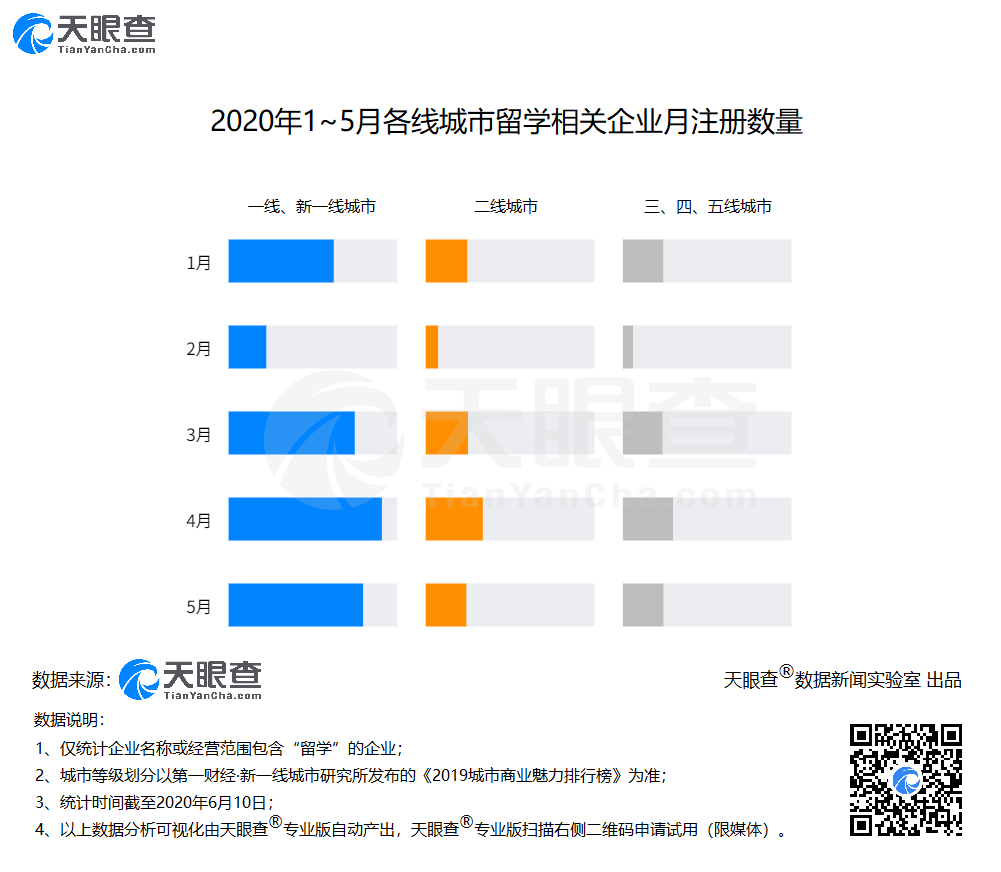 另外,我国今年新增注册的留学相关企业主要集中在一线和新一线城市。天眼查专业版数据显示,一线和新一线城市今年前五个月共新增4,407家相关企业,是二线城市的2.86倍,是三四五线城市的3.06倍。