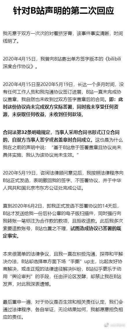 今日上午,在B站发出声明之后,“巫师财经”二次回应B站的声明,再次表示该协议尚未完成双方实际签署,同时晒出其在2020年5月对于不签署协议完成的公证书。