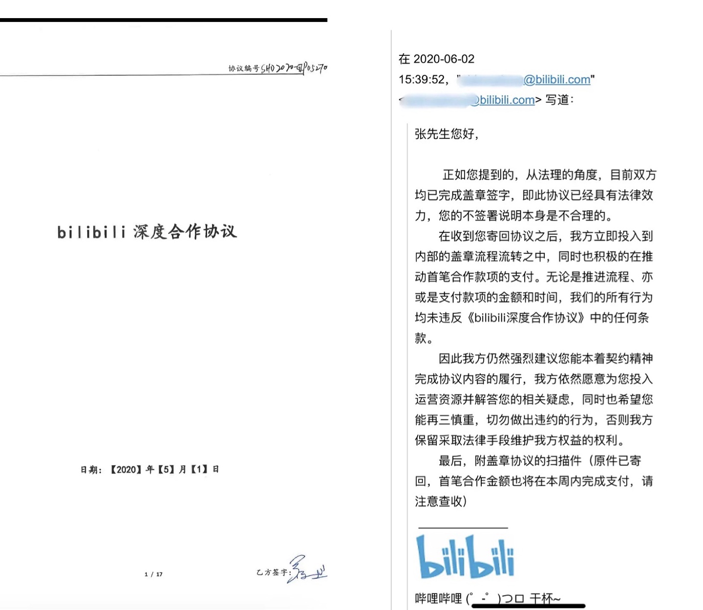 在邮件中,B站表示“此协议已经具有法律效力,您的不签署说明本身是不合理的。”