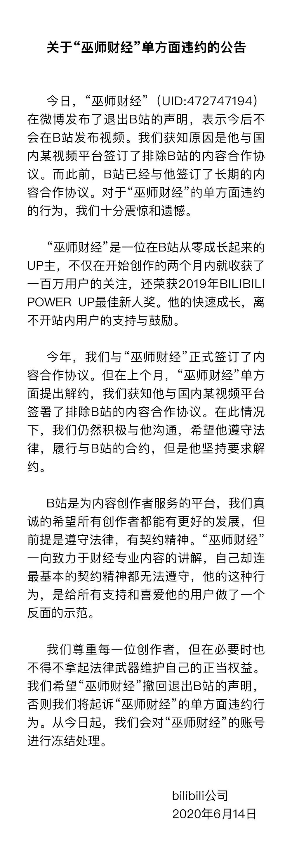 对此,B站在首次回应中称,平台已经与其签订长期内容合作协议,但在上个月“巫师财经”单方面提出解约,B站获知其与国内某视频平台签署了排除B站的内容合作协议。B站表示,希望“巫师财经”撤回退出B站的声明,否则将起诉“巫师财经”的单方面违约行为。目前,B站已对“巫师财经”的账号进行冻结处理。