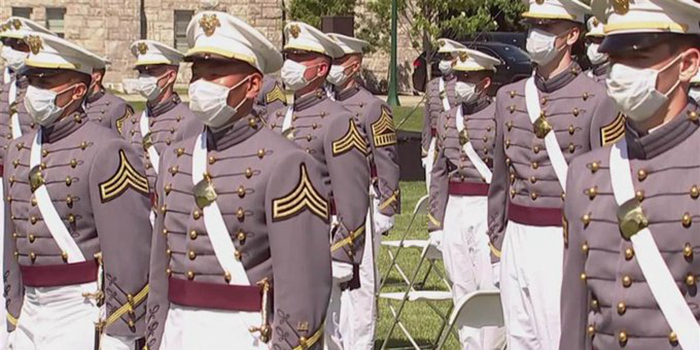 受新冠疫情影响,出席特朗普演讲的所有毕业生都依照社交疏离要求,相隔六英尺而坐。军乐队则隔着塑胶玻璃演奏,防止唾沫飞溅。除毕业生本人之外,亲属均不得到场。