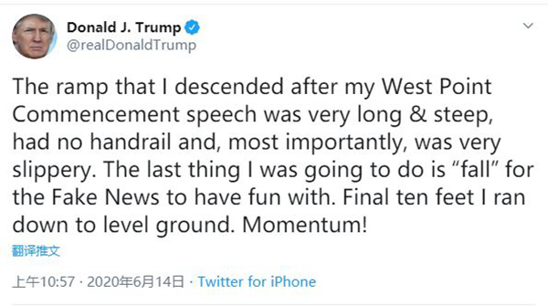 对此,他在Twitter反击称讲台的坡道很长很陡,没有扶手,“我最不想发生的就是摔倒,让‘假新闻’看笑话”。
