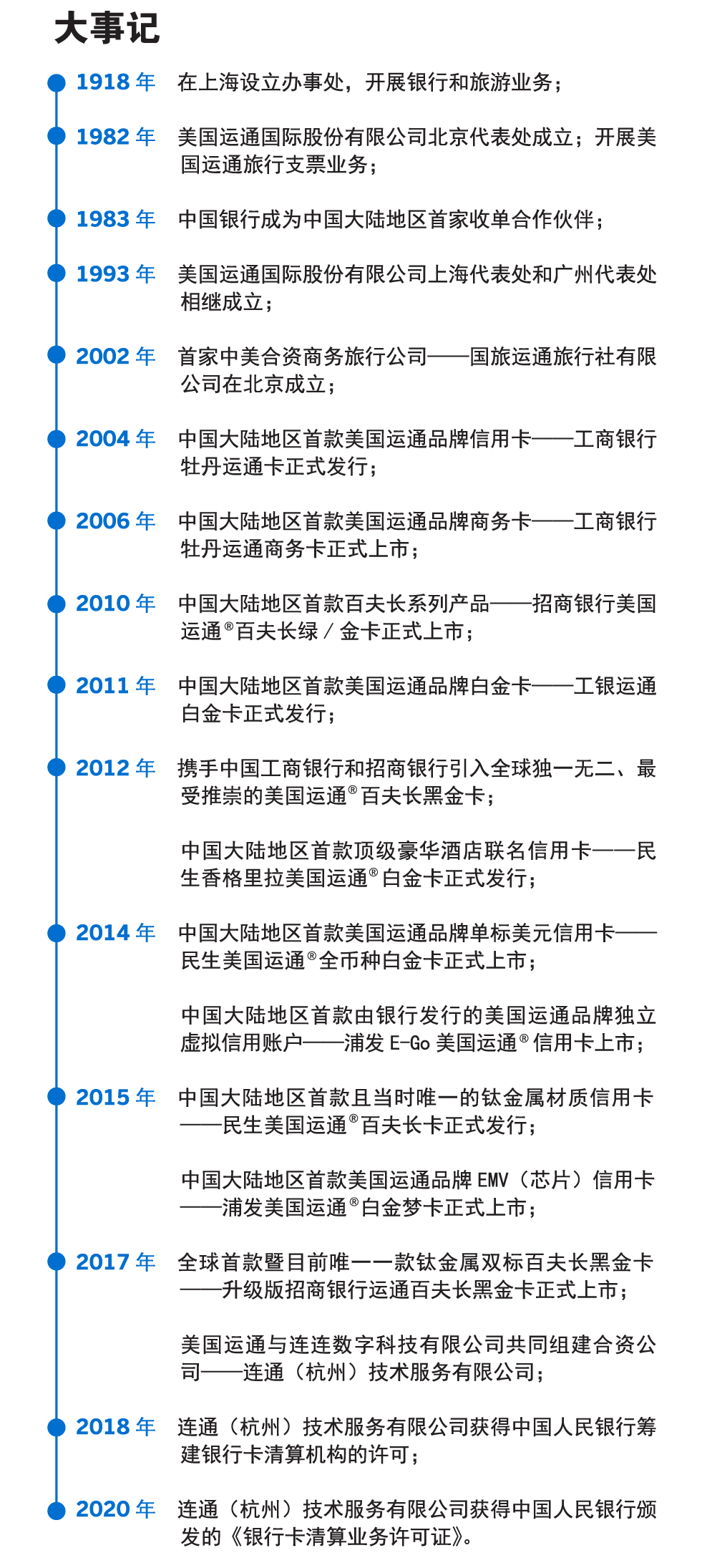 美国运通与中国市场的渊源最早可以追溯到1916年的香港。1918年,美国运通来到上海,是最早在中国大陆市场服务全球客户的公司之一,美国运通在中国大陆市场有两大主营业务——信用卡服务和旅游服务。