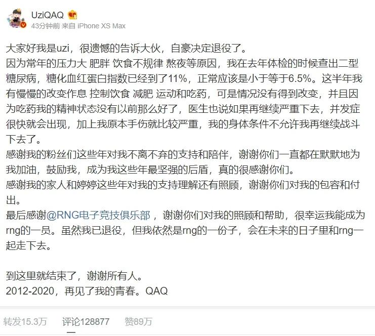 6月3日,前英雄联盟职业选手UZI宣布退役,LPL一颗璀璨的明珠黯然消逝了,与粉丝们猜测的状态下滑无关,迫使他退役的因素是长年折磨他的手伤肩伤以及最新爆出来的二级糖尿病。