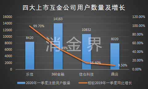而趣店注册用户总数为8020万人,相较2019年第一季度同比增长9.5%,增速最慢。