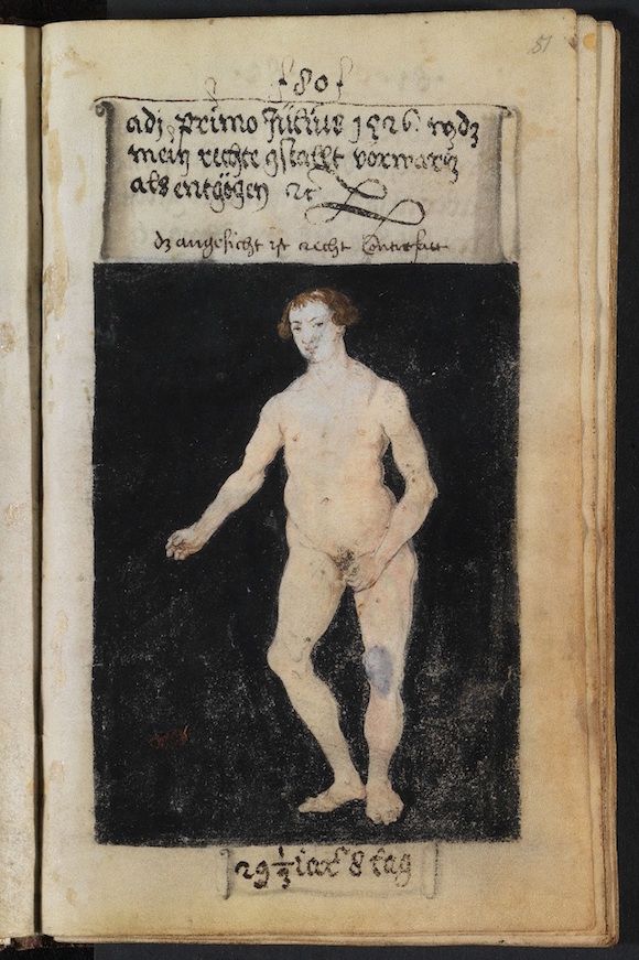 在 29 岁的时候 Schwarz 感觉自己身材日渐臃肿,他大胆的找了画师将自己全裸的身体正反面都画了下来。这个决定在当时来说实在不同寻常,大概也因为如此,这个裸体的手稿在他 63 岁时完成整本书时候才被装订进去,因此没有人知道这页在这么多年来是否被其他人看过。如果有人看过,不知道他又选择了哪一张呢?