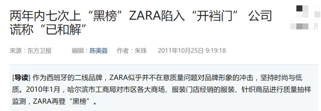 ZARA 在进军中国后的2年内,就因为质检问题,7次荣登黑榜。