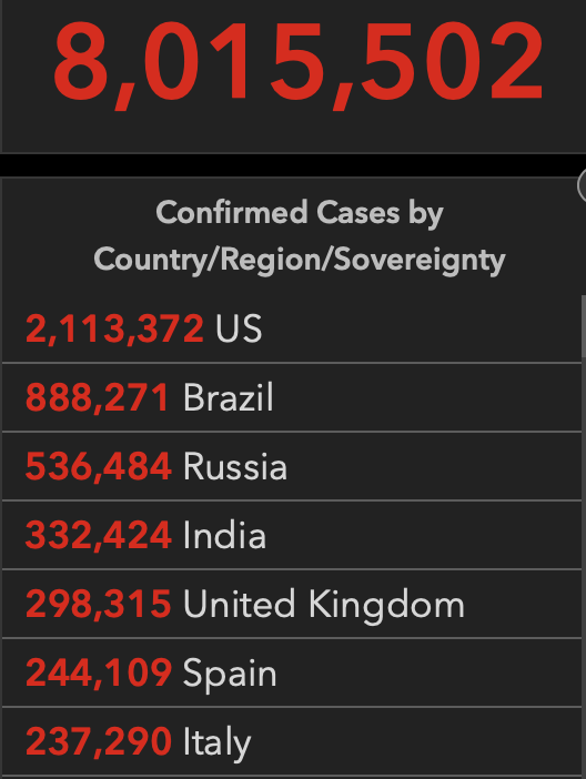 美国约翰斯·霍普金斯大学发布的实时统计数据显示,截至北京时间6月16日10时,全球累计确诊8015502例,累计死亡436322例。