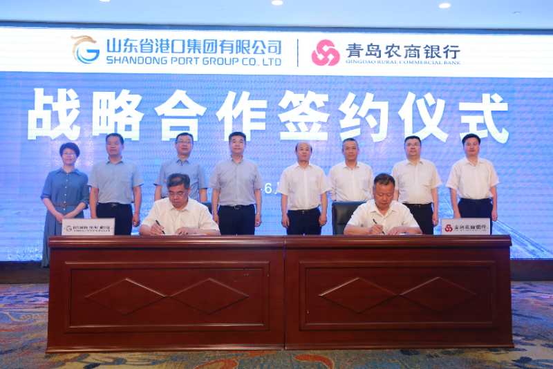 在即将迎来青岛农商银行行庆八周年、山东省政府批准组建山东省港口集团一周年之际,2020年6月15日,青岛农商银行与山东省港口集团在农商财富大厦举办全面战略合作签约仪式。山东省港口集团董事长霍高原、总经理李奉利、财务总监张波、董秘兼办公室主任刘志国、财务管理部部长兼金控公司总经理姜春凤,青岛农商银行董事长刘仲生、行长刘宗波出席仪式。