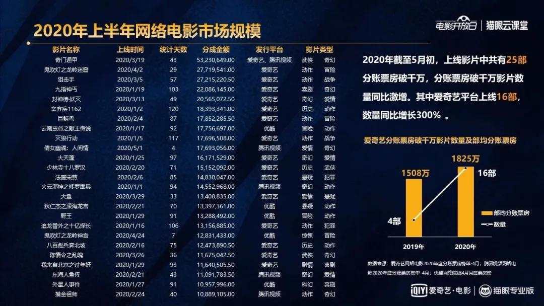 截至5月初,2020年上半年上线的网络电影中共有25部影片分账票房超千万。其中爱奇艺占16席,推出新分账模式仅几个月的腾讯视频占5席(《奇门遁甲》为联播),而优酷也仅有5部影片上榜,且集中在中后段。