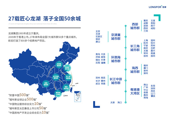 龙湖集团,作为中国房地产开发企业综合实力10强,27载走进50 余城,累计800余个开发项目,以匠心筑就品质典范,荣获福布斯亚太区最佳上市公司50强。不仅如此,目前龙湖物业也已进驻全国118个城市,服务超330万户业主,业主满意度连续十一年超过 90%,位列中国物业服务企业品牌价值TOP10。
