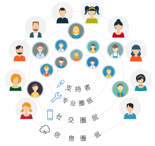 职场圈层,由职场关系亲疏可以划分为:支持者圈层,专业圈层,社交圈层和信息圈层。