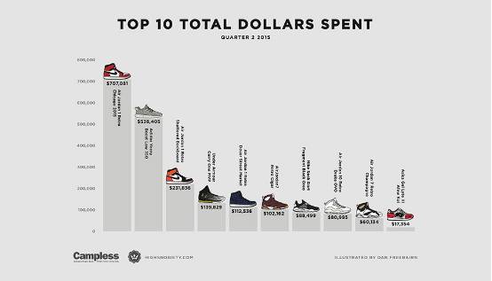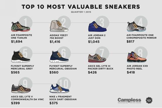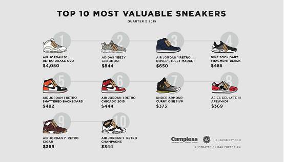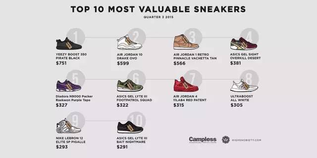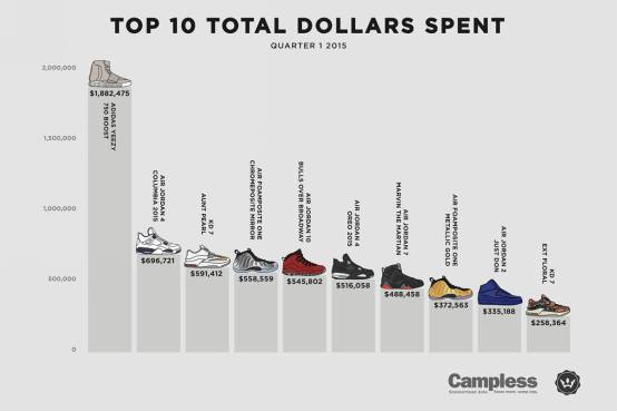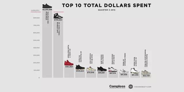 上三张图分别是2015年第1、2、3季度最值钱10双球鞋排名。耐克依然占据着半壁江山,但我们能够看到,韦斯特的Yeezy系列已经让阿迪加快了追赶的脚步。(数据来源:球鞋数据网站Campless)
