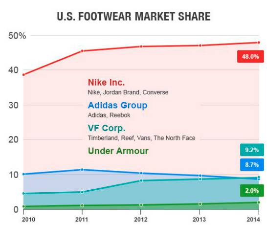 2014年,阿迪在美国运动服装市场的市场占有比是9%,但耐克达到了惊人的48%。NPD咨询公司的体育行业分析师马特·鲍威尔在接受Highsonbiety采访时说:“阿迪2015年的产品非常好,成绩也很棒。如果他们继续保持耐心,继续保持出品如此出色的产品线,可以收回曾经失去的市场占有率。但就目前来看,还没有人能够威胁到耐克的位置。”