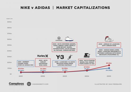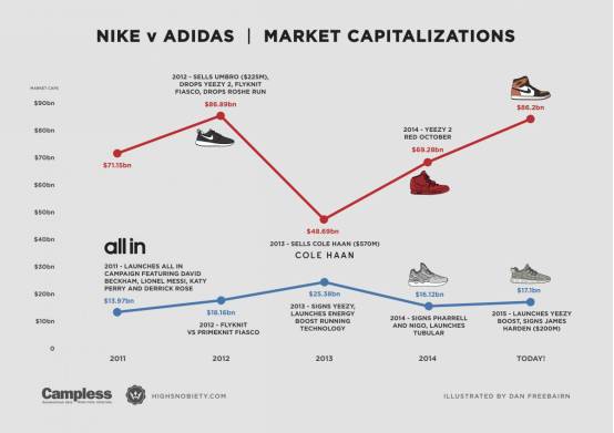 三条战线的相互呼应,让三条杠在2015年的运动时尚和球鞋领域呼风唤雨,消费者不仅看到了优质的作品,也看到了阿迪收复失地的决心。当然,阿迪在重新崛起的道路中,不得不面对一个看上去不可能打败的对手—耐克。