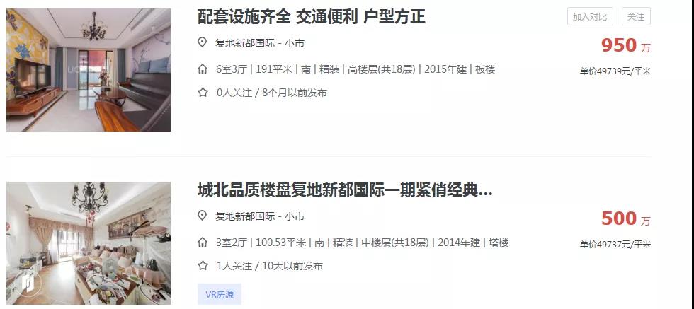 如此配套的加持下,项目周边二手房也水涨船高,如复地新都国际、葛洲坝招商紫郡蘭园等小区。多套房源挂牌单价便已超4.9万/㎡,直冲5万/㎡。