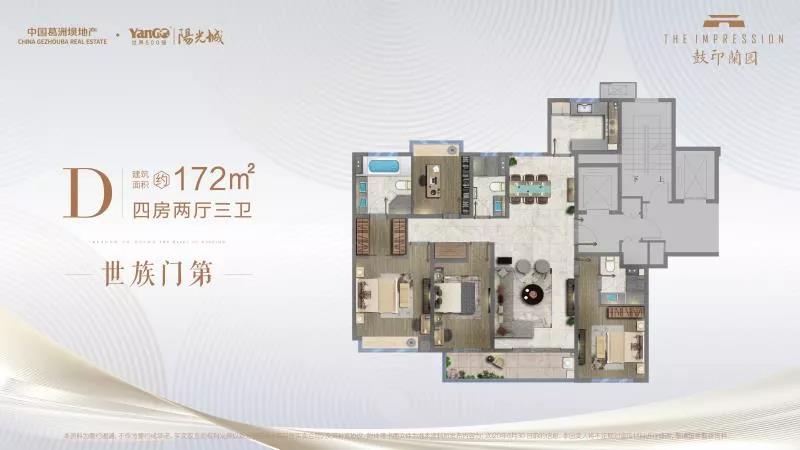 建面约172㎡的四室两厅三卫阔绰空间,满足四世同堂的居住需求,整个户型灵活多变、动静分离,除了满足日常居住外,还可以根据家庭周期变化和不同阶段主人、儿童、老人都拥有各自独立的空间和活动区域,互不干扰,私密安静。